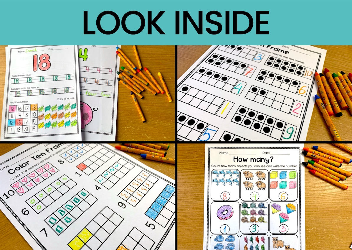 1. Number Sense & Counting: Everything from recognizing numbers to sequencing and counting objects, including teen numbers and connecting numbers to quantities. Students get repeated, varied practice to solidify early numeracy.